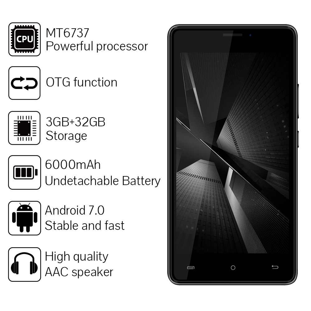 CUBOT H3 SmartPhone 3GB RAM 32GB ROM 5.0" IPS MTK6737 Quad Core Android 7.0 6000MAH 13.0MP Fingerprint 4G LTE Mobile Phone